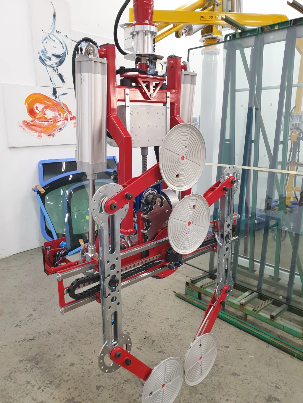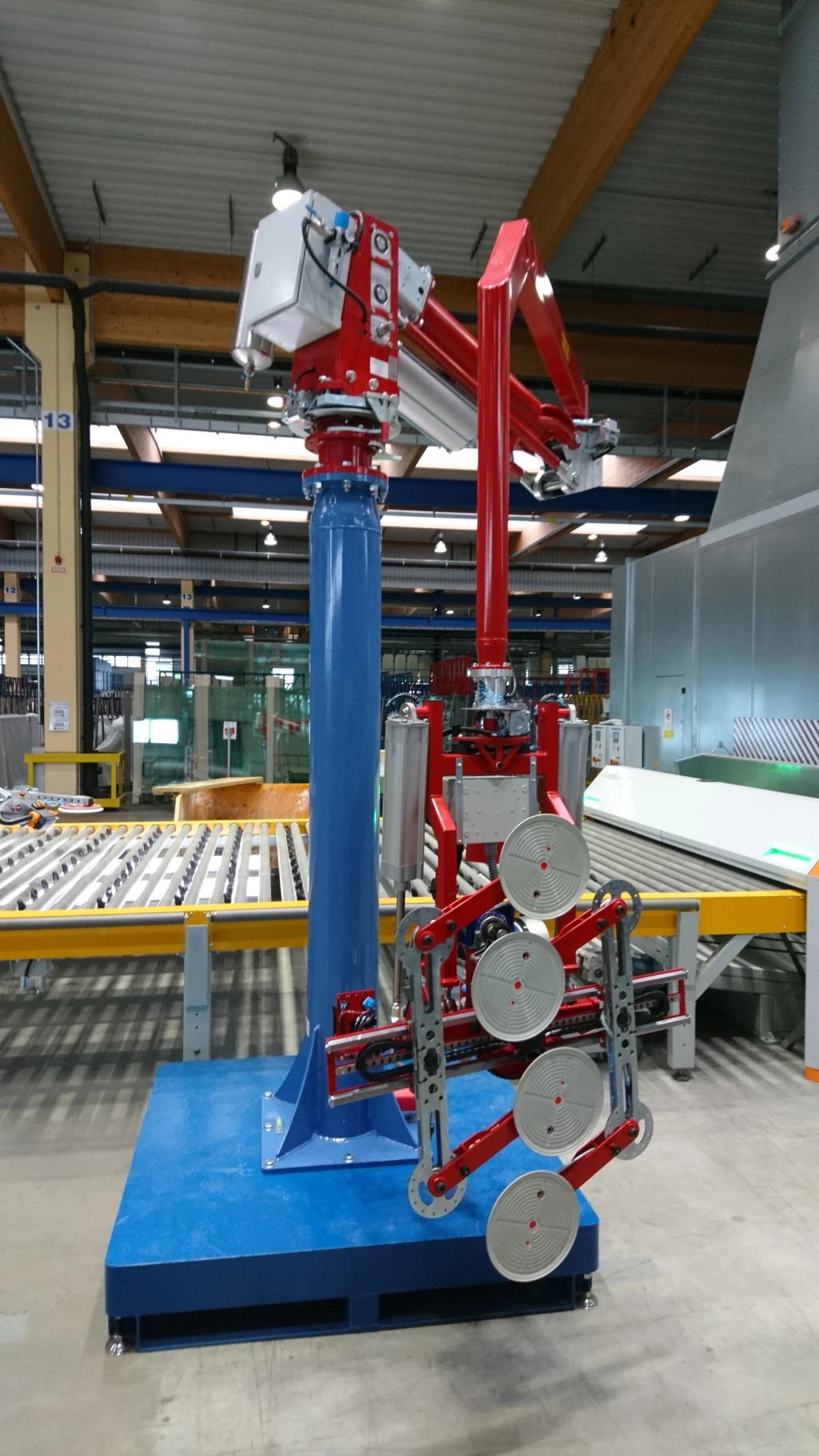 Ein roter Knickarm Manipulator mit einer Aufnahmevorrichtung und Sauggreifern für Glasscheiben