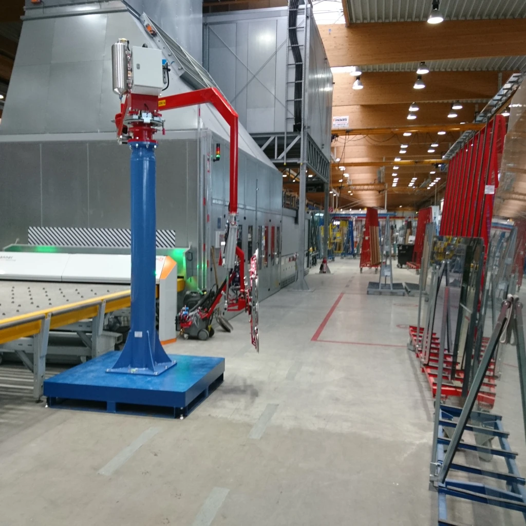 Hier kommt unser PARALLEL Manipulator zum feinfühligen Umsetzen von Glasscheiben in der Glasindustrie zum Einsatz. Durch die mobile Bodenplatte kann der rein mit Druckluft betriebene Manipulator an verschiedenen Arbeitsplätzen eingesetzt werden. Die Sauggreifeinheit kann auf verschiedenste Scheibengrößen eingestellt werden. Durch Endlosdrehdurchführungen kann die Scheibe in sämtlichen Achsen uneingeschränkt bewegt und gedreht werden werden. Bremseinheiten an den Achsen verhindern ungewollte Bewegungen.
