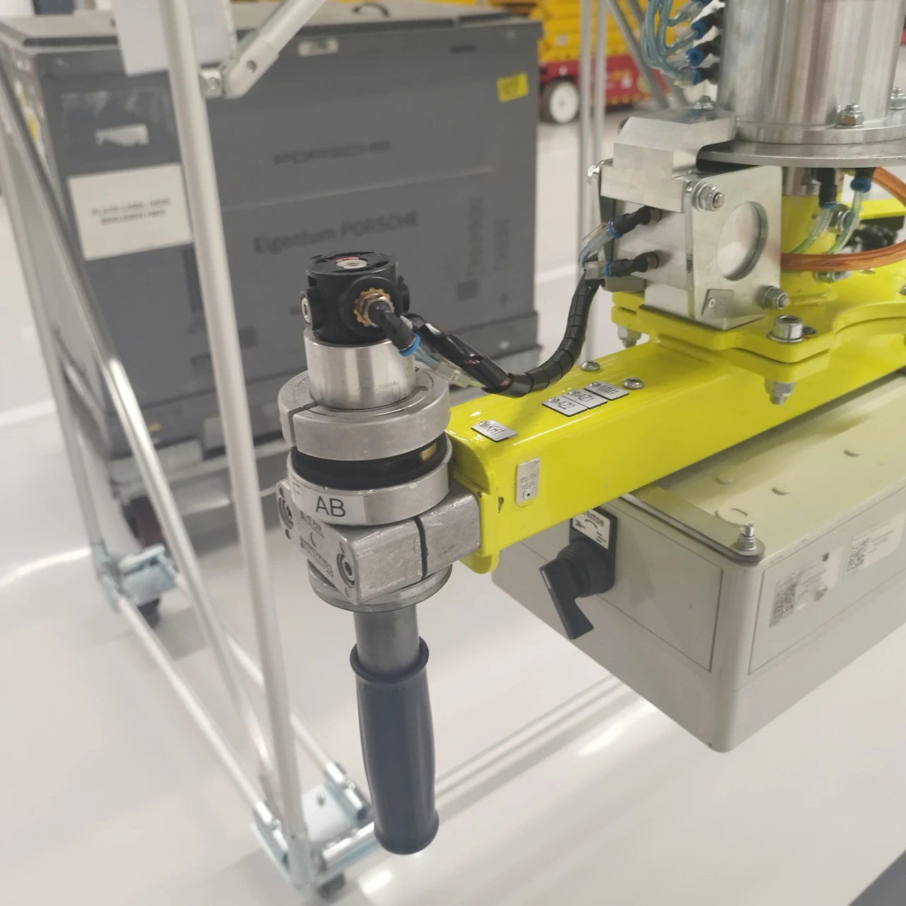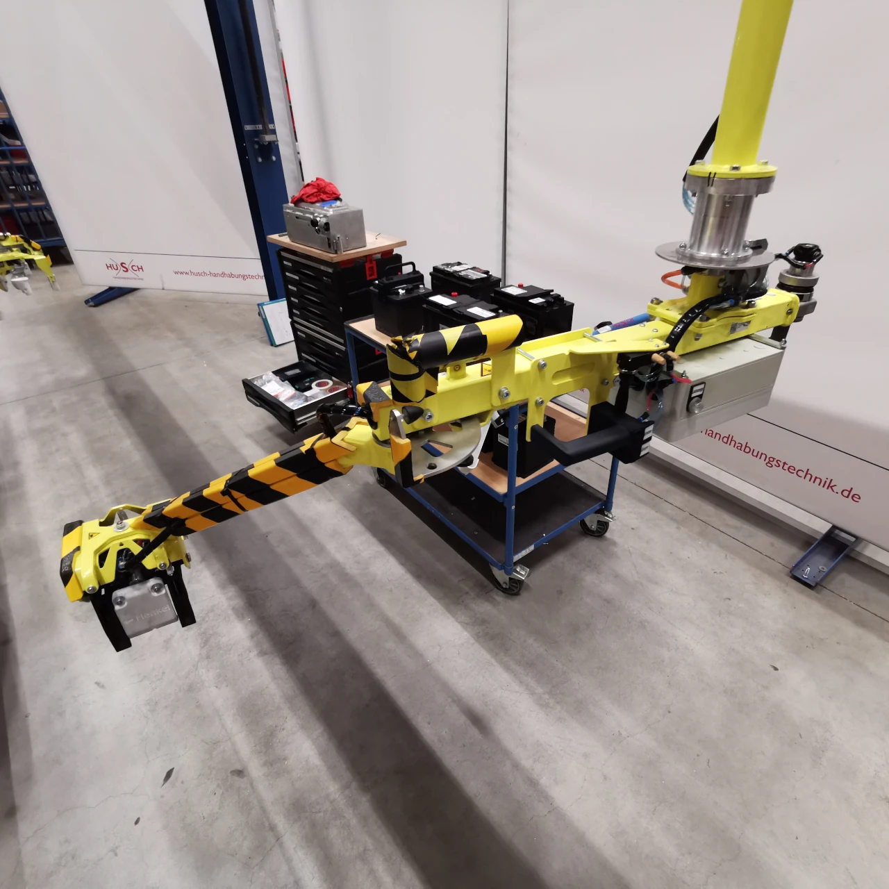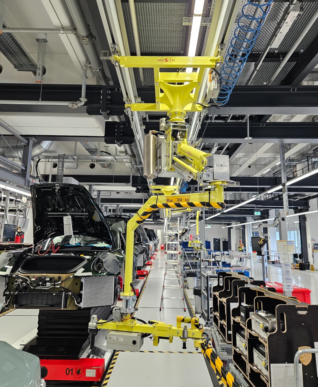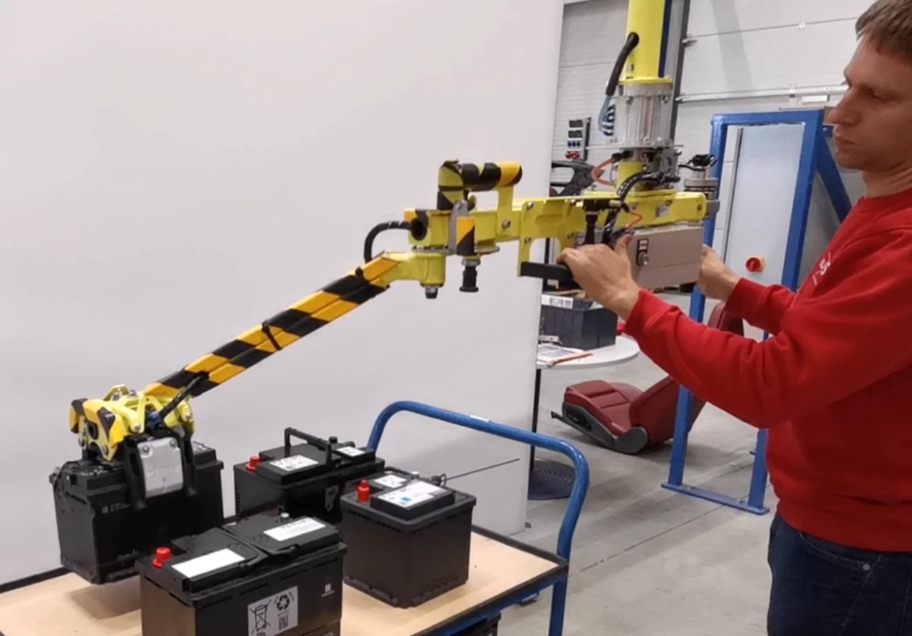 Für das Einsetzen von Autobatterien in den Technikraum bzw. Motorraum von Fahrzeugen kommt hier unser PARALLEL Manipulator in der Produktionsline der Automobil Industrie zum Einsatz. Der Manipulator ist in der Kranbahn verfahrbar. Die Fahrbewegung kann durch einen Reibradantrieb unterstützt werden. Mit dem individuell produzierten Lastaufnahmemittel können Batterien mit und ohne Henkel sicher gegriffen werden. Die Laststeuerung für die Balancierung findet in diesem Fall mit einem Drehgriff statt.