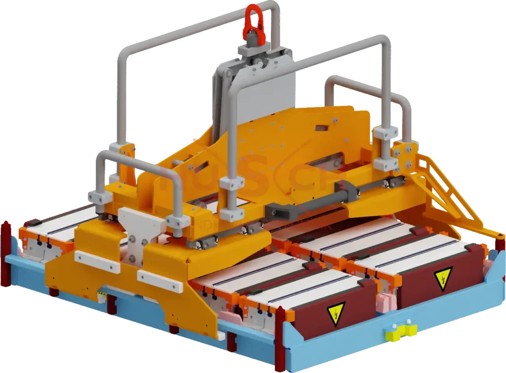 Hier wird ein loses Lastaufnahmemittel am Kettenzug im Leichtkransystem zum Heben und Bewegen von Behälterdeckeln und Tablaren eingesetzt. Der Verriegelungsmechanismus wird beim Anheben durch das Hubgerät automatisch geöffnet und geschlossen. Ein Öffnen unter Last ist selbstverständlich nicht möglich.