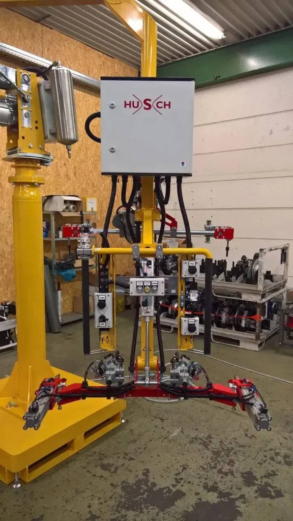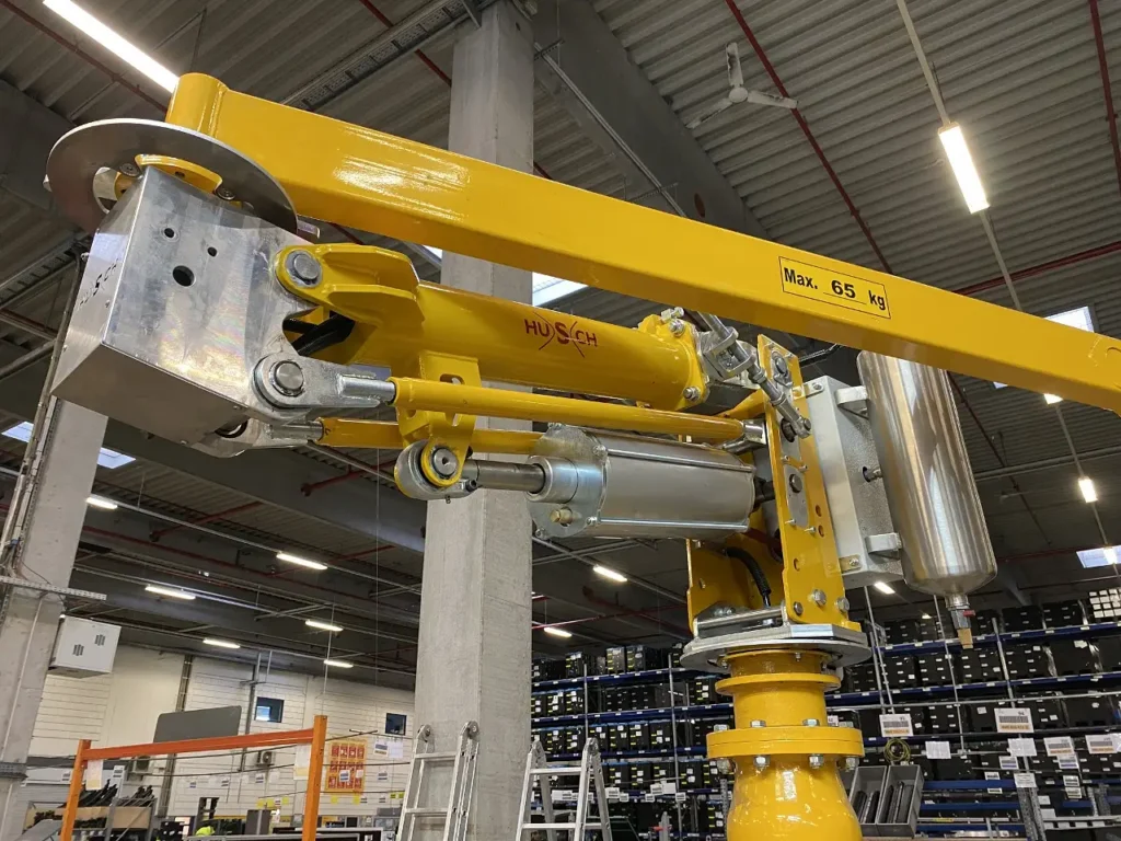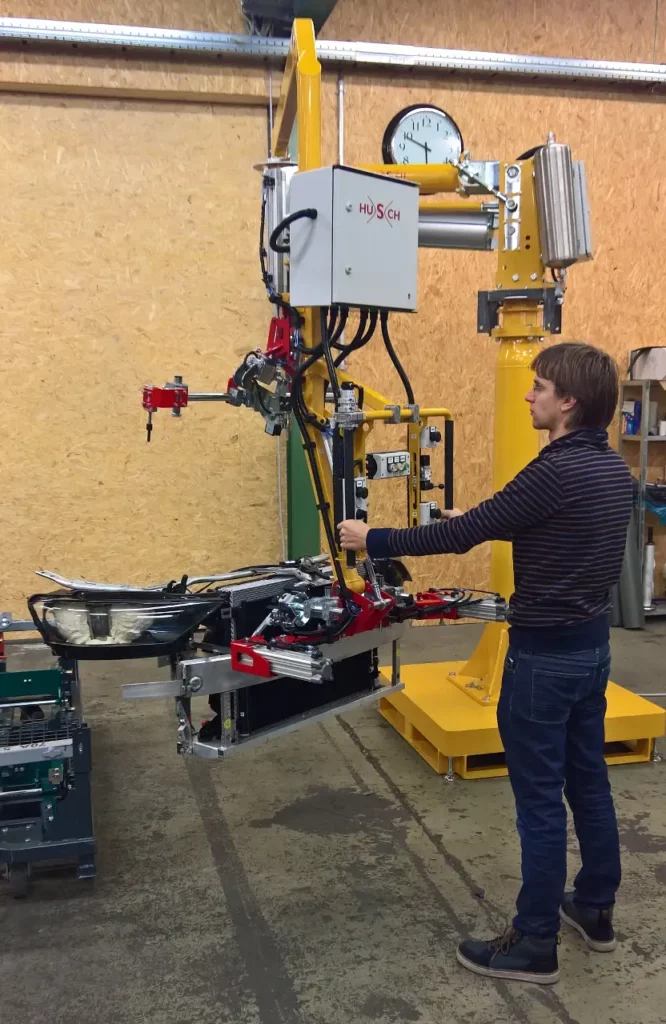 Mit unserem PARALLEL Manipulator werden Frontend Module aus Ladungsträgern umgesetzt. Um die Anforderung zu erfüllen, verschiedene Bauteiltypen umzusetzen wird die jeweilige Greifeinheit eingeschwenkt bzw. zugestellt. Der pneumatische Gewichtsausgleich mit Balancierfunktion wird durch einen Drehgriff zur Lastvorwahl angesteuert. Durch die mobile Bodenplatte kann das Handhabungsgerät mittels Gabelstapler oder Gabelhubwagen an beliebigen Arbeitsplätzen eingesetzt werden. Das Verankern am Hallenboden ist nicht notwendig.