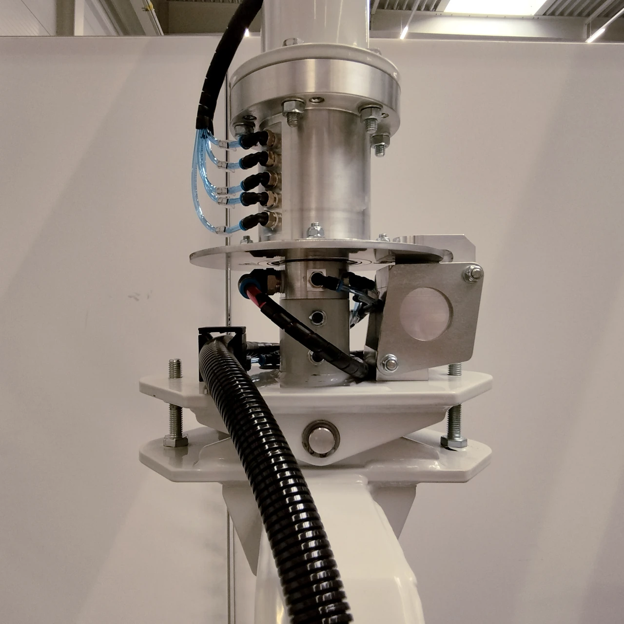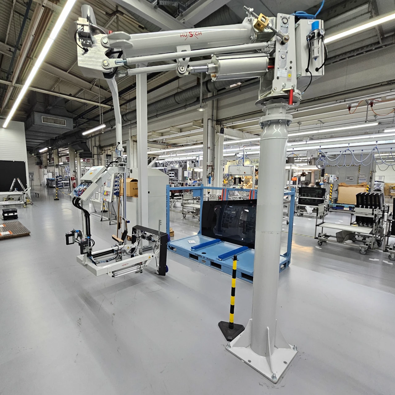 Hier kommt unser pneumatischer SEIL Manipulator zum Frontscheiben und Heckscheiben umsetzen zu Einsatz. Um einen großen Arbeitsbereich abzudecken ist dieser im Leichtkran- Schienensystem verfahrbar. Um Hallensäulen zu umfahren wurde ein Teleskopauszug an der...