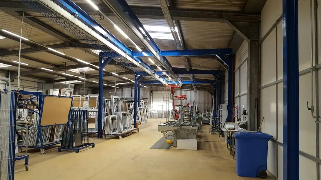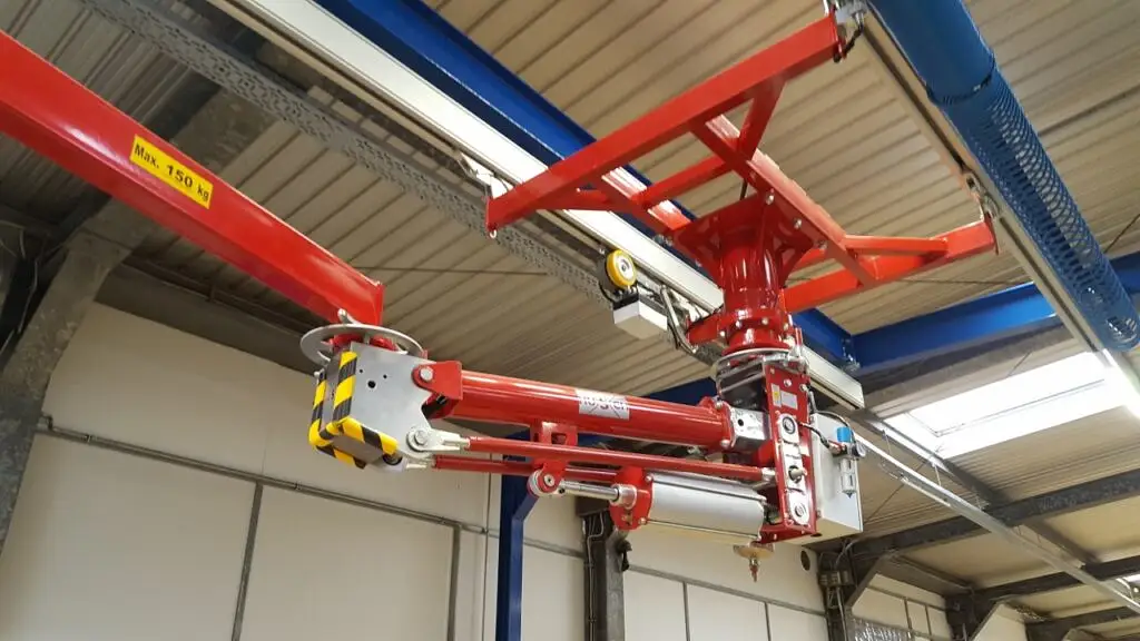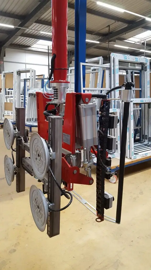 Zum Umsetzen von Glasscheiben und fertig verglasten Fenster und Türen kommt hier unser PARALLEL Manipulator im Leichtkransystem zum Einsatz. Durch die pneumatische Balanciersteuerung können die Elemente beschädigungsfrei von einem Mitarbeiter umgesetzt werden. Die Fahrbewegung in der Kranbahn wird durch einen pneumatischen Reibradantrieb unterstützt. Das Saugrahmen verfügt über vielfältige Verstellmöglichkeiten um verschiedenste Scheibengrößen aufnehmen zu können.
