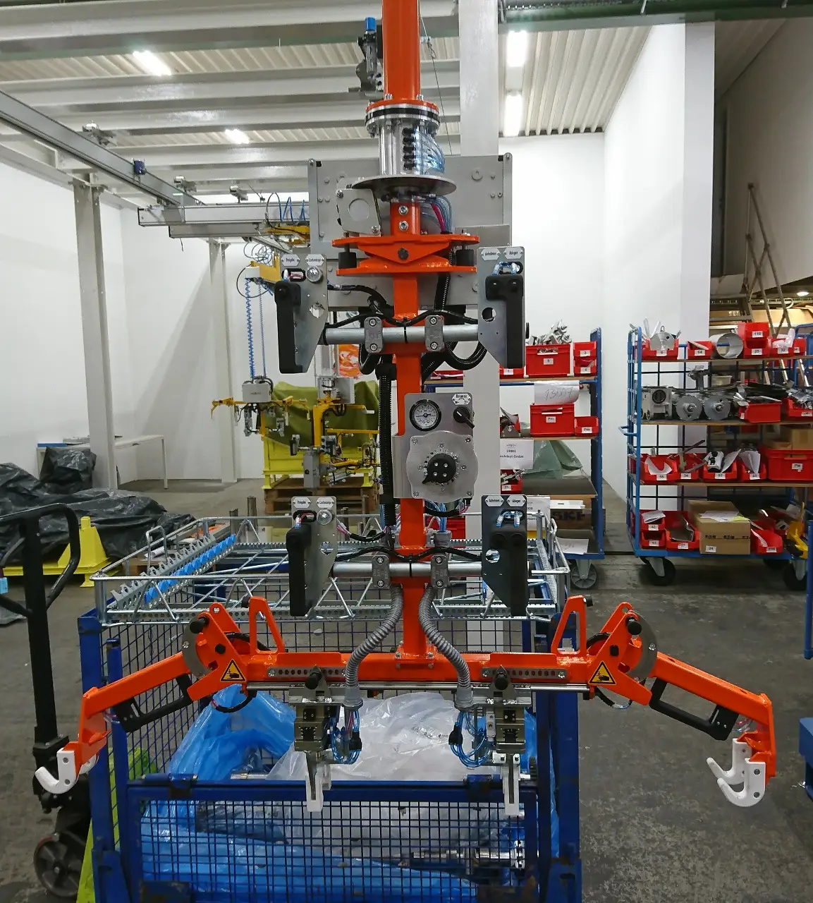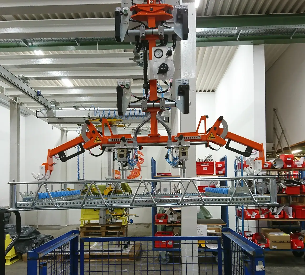 Hier kommt unser PARALLEL Knickarm Manipulator auf Standsäule zum Einsatz. Mit der Aufnahmevorrichtung können die Gitterkörbe sowie die Nockenwellen mühelos umgesetzt werden. Die Hubbewegung wird durch einen pneumatischen Zylinder mit Balancierung realisiert.